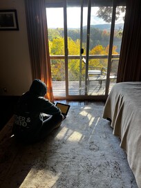 Oh man this is exactly what we had in mind for a quick weekend getaway! This beautiful cabin literally sits on the side of a mountain. All of the nooks and crannies where you can hang out with family whether it is the picnic table in the yard, around the campfire, walking to see the Bluff, or just sitting on the deck, enjoying a cup of coffee is amazing.It was so comfortable, well thought out and cozy, which we really appreciated coming from the hustle and bustle of life.We ventured out and went about 40 minutes north to Mountain Town and went thrifting, ate pizza, and then went bowling. The town was so wonderful. My 17 year-old and my 19-year-old were so bummed to go home and asked when we would be planning to go back. Soon I hope!