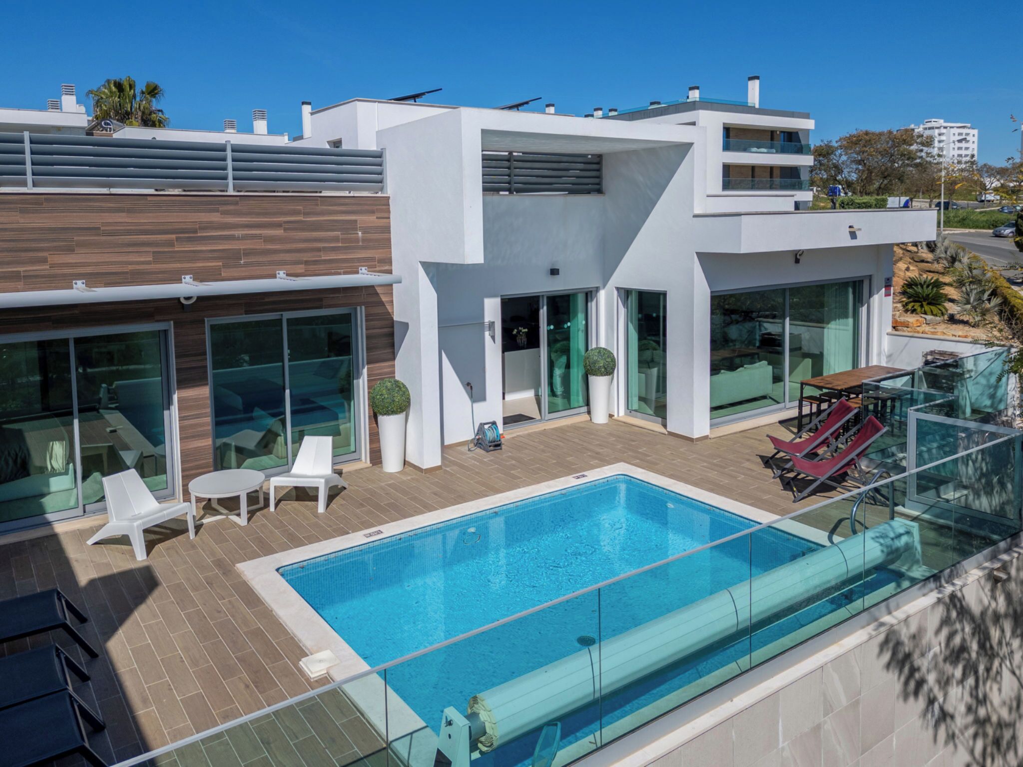 "Linda V3 Lote 67 - VIP Properties", 4-room house 245 m2. Spacious and bright, very comfortable and modern furnishings: living/dining room with cable TV, international TV channels, flat screen and forced-air heating. Exit to the terrace, to the swimming pool. 1 room with 1 french bed (160 cm, length 200 cm), shower/WC, TV, air conditioning and forced-air heating. Exit to the terrace, to the swimming pool. 1 room with 1 french bed (160 cm, length 200 cm), TV, air conditioning and forced-air heating. Exit to the terrace, to the swimming pool. 1 room with 2 beds (90 cm, length 200 cm), air conditioning and forced-air heating. Open kitchen (oven, dishwasher, toaster, kettle, microwave, freezer, electric coffee machine, Capsules for coffee machine (Delta Q Not Incl), cooking island). Exit to the terrace, to the swimming pool. Shower/WC. Terrace furniture, balcony furniture, barbecue (portable), deck chairs (4). Panoramic view of the sea and the resort. Facilities: washing machine, children's high chair, baby cot for up to 2 year olds (extra). Internet (WiFi, free). Parking at the house. Suitable for families. 167026/AL
