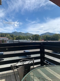 The Suite is has a privacy wall separating one queen bed from the living space. In the living space there is a second queen bed and a couch. An air mattress and/or pack-n-play can be added upon request. The suite has its own bathroom, with shower and tub, and a huge private deck overlooking the main downtown area of Bryson City.