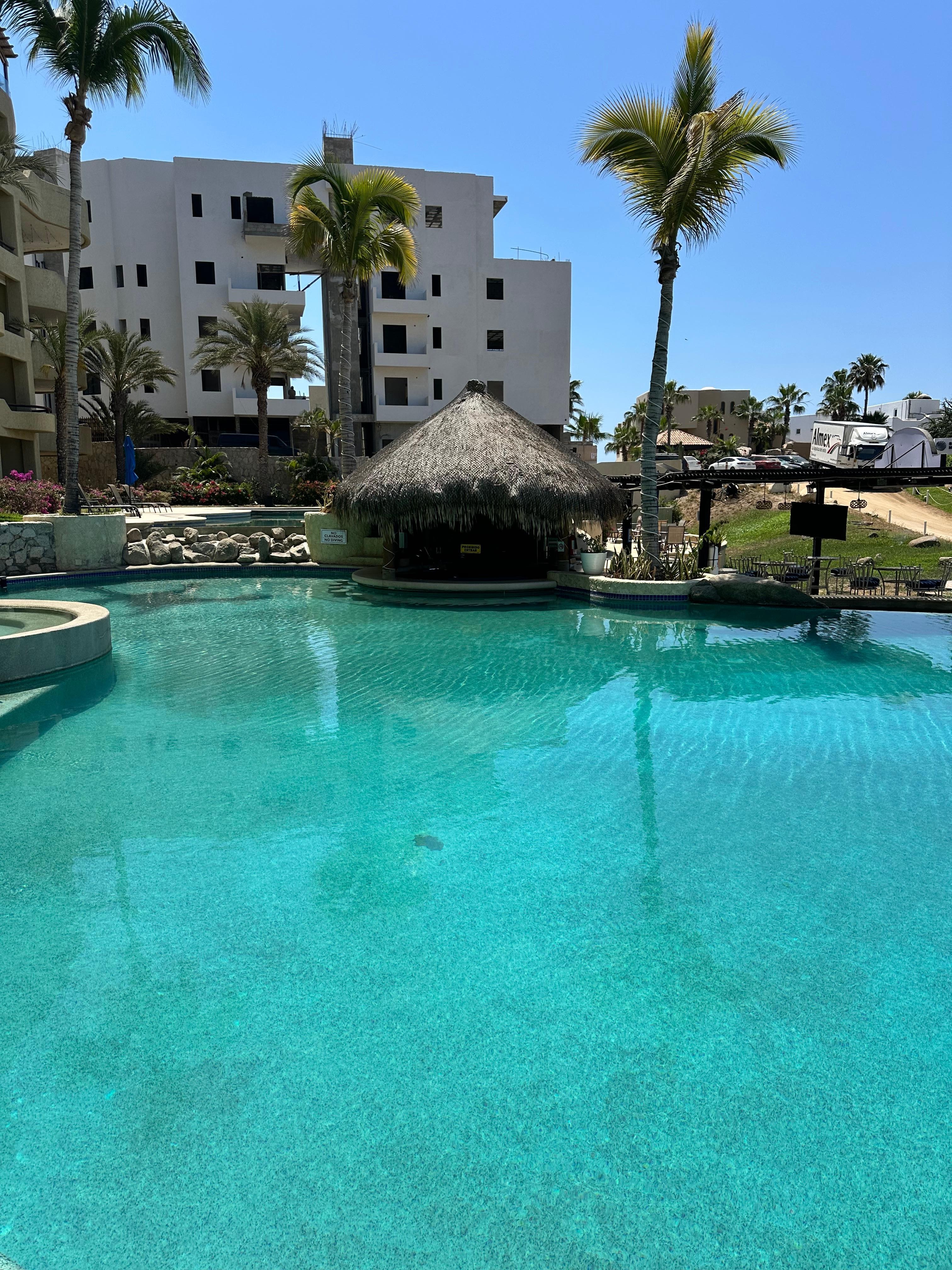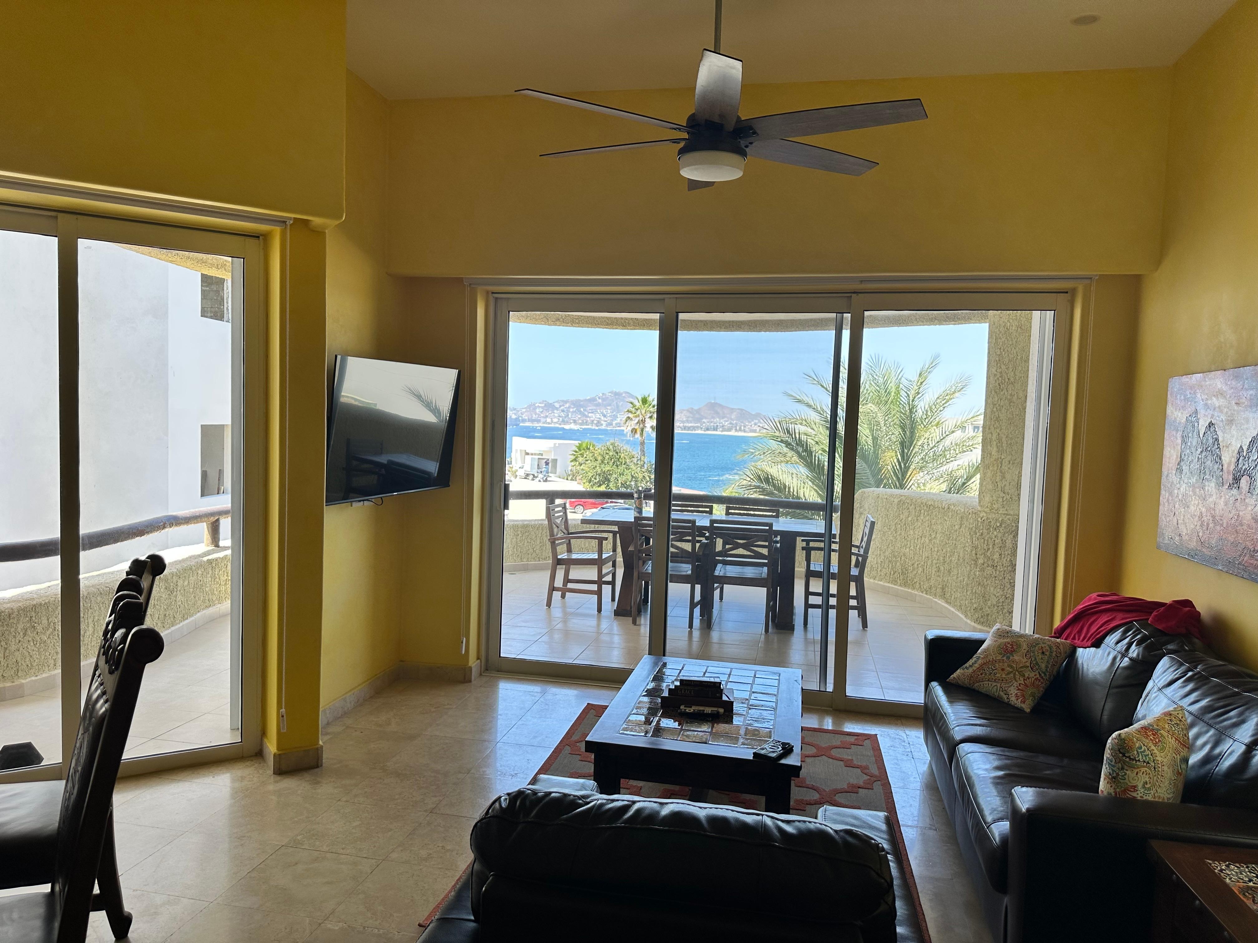 Come be our guest and see the beauty that we found in the Mexican Baja. It is truly a Mexican hacienda with hand-crafted furniture and all the comforts of home that we want all of our guests to enjoy. This condo is located on the Sea of Cortez and a 5-minute drive to downtown Cabo San Lucas. Comfort and privacy await you on this corner unit with a large wrap-around patio overlooking both the resort pool and the Sea of Cortez. The resort offers 2 beaches: Monument Beach which is for the experienced surfer and Cabo Bello Beach is ideal for snorkeling, picking up sea treasures, sunbathing, relaxing, and feeding the fish which will eat right out of your hand just bring some bread. Our building offers a very large pool that overlooks the ocean, cruise ships, and yachts. See the sunrise over the ocean or listen to the waves at night from the comfort of your bed. Your condo includes 3 55-inch Smart TV’s and high-speed WIFI. Our condo has everything to make your vacation perfect, we have 4 Tommy Bahama Chairs, 2 umbrellas for the beach, a beach bag, towels, and a cooler to put your drinks in. An over-size balcony allows you to relax with a coffee while watching the sunrise over the ocean, enjoy cocktails for happy hour, and keep an eye on friends at the pool. Our condo has 2 master suites with king-size sleep number beds and comfortable pillows. We have 2 full-size bathrooms with large walk-in showers, a full-size washer & dryer, and 3 mini split air conditioners. The separate living area has a leather couch, chair, and a 6-person dining room table. Included in the kitchen is a full-size refrigerator, stove/oven equipped with an air fryer, coffee maker, ninja blender, toaster, cooking utensils, flatware, hand-blown Mexican glassware, and fiesta ware for dining. The cold water in the sink & refrigerator is filtered, and there is also on-demand hot water. You will want to dine outside on the large patio table and enjoy the spectacular views. The patio can be accessed from either the living room or the bedroom. And, if you are an amateur chef, the condo is equipped with many spices, utensils, and cookware you would need for trying your hand at new "Mexican" recipes! As our "guest," you will have access to our pool and a designated parking stall for the unit. The TVs are smart TV’s so they are connected to WIFI so you can enjoy your streaming service (Netflix, Amazon Prime, Disney+, etc.). We do have a Cabo TV app subscription that does give you access to many tv and movie channels.