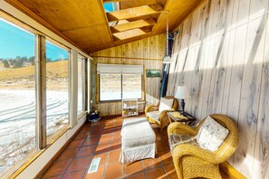 Rustic home with mountain views, wood-burning stove, basketball court, & patio