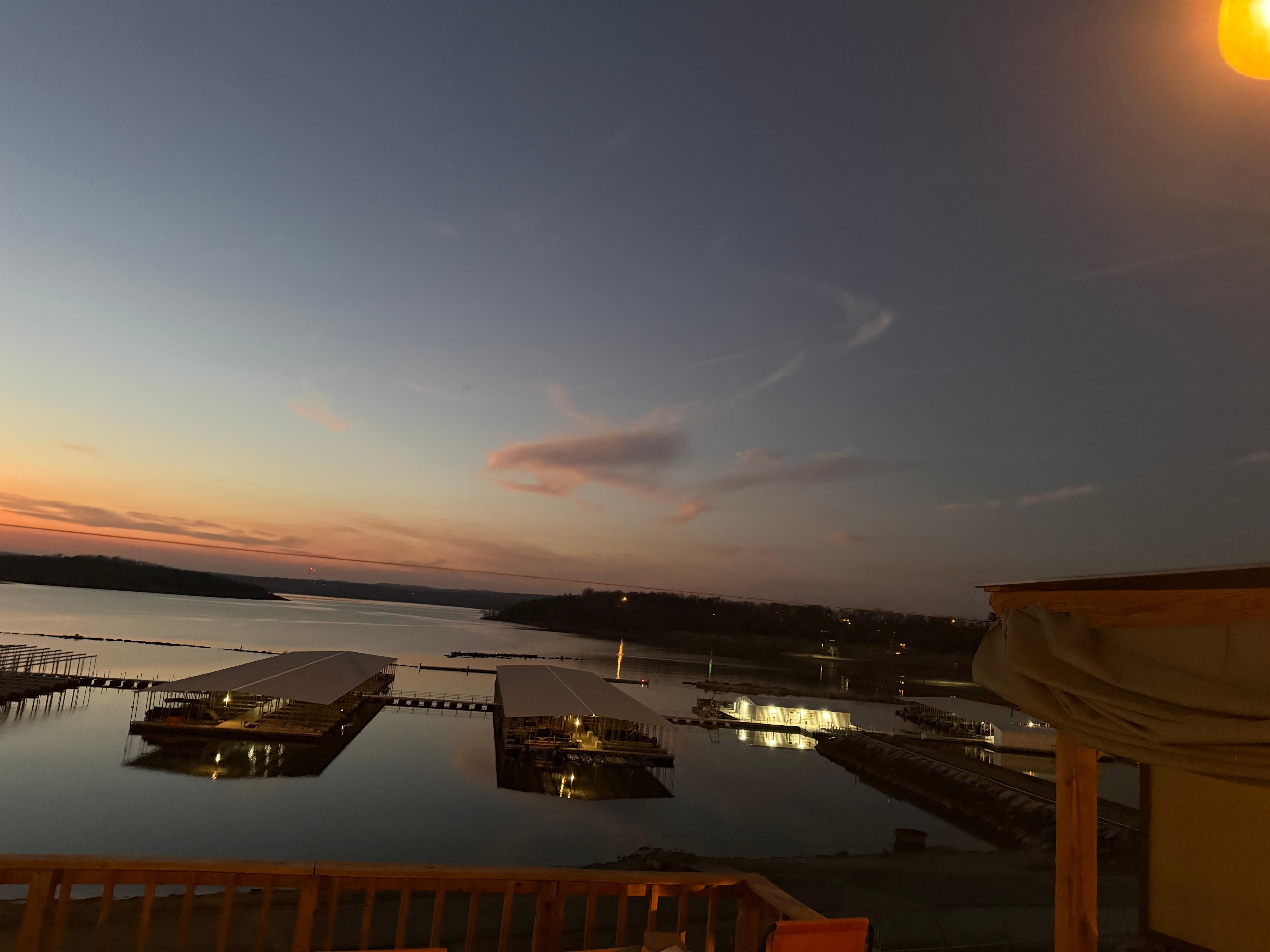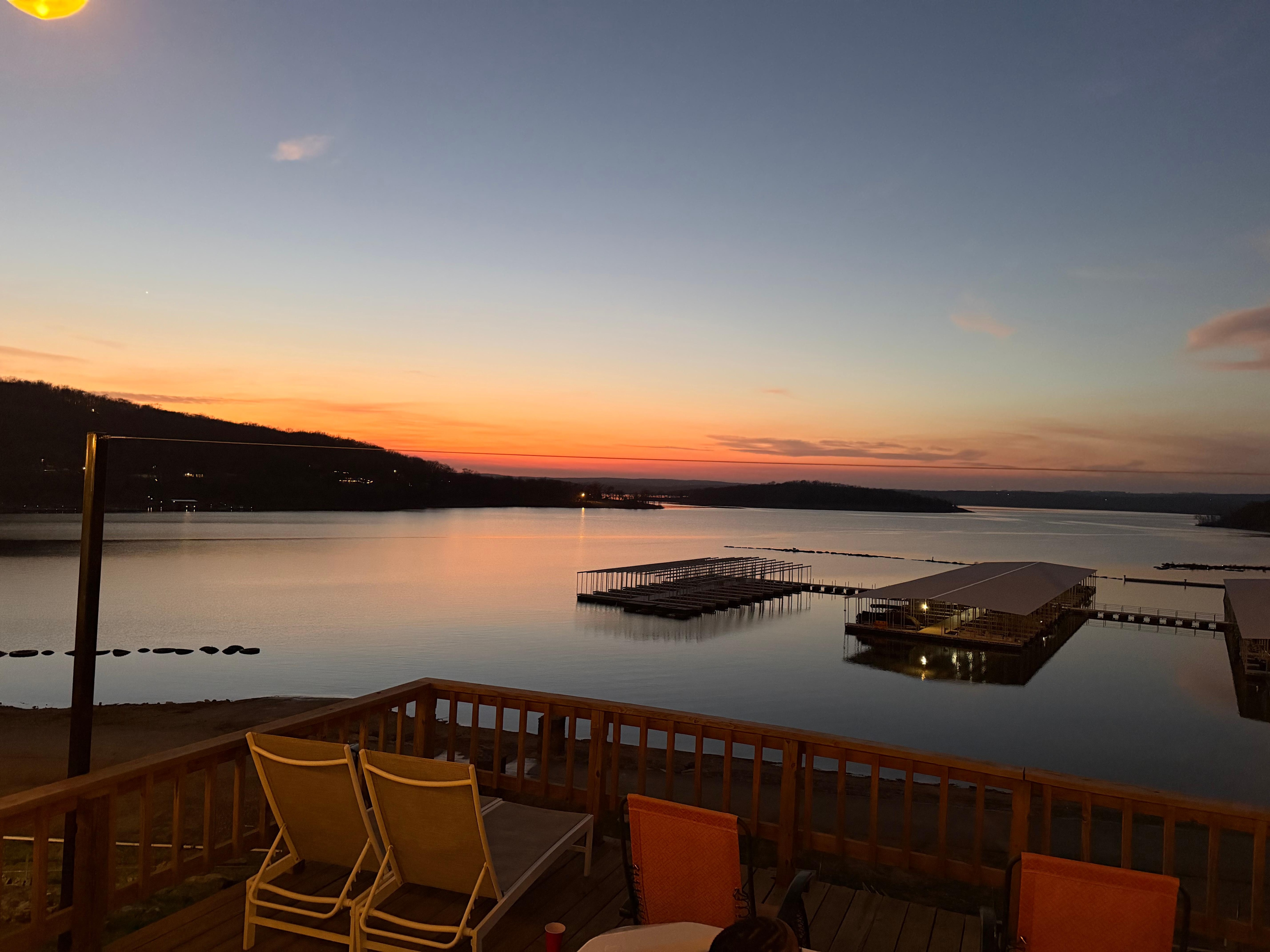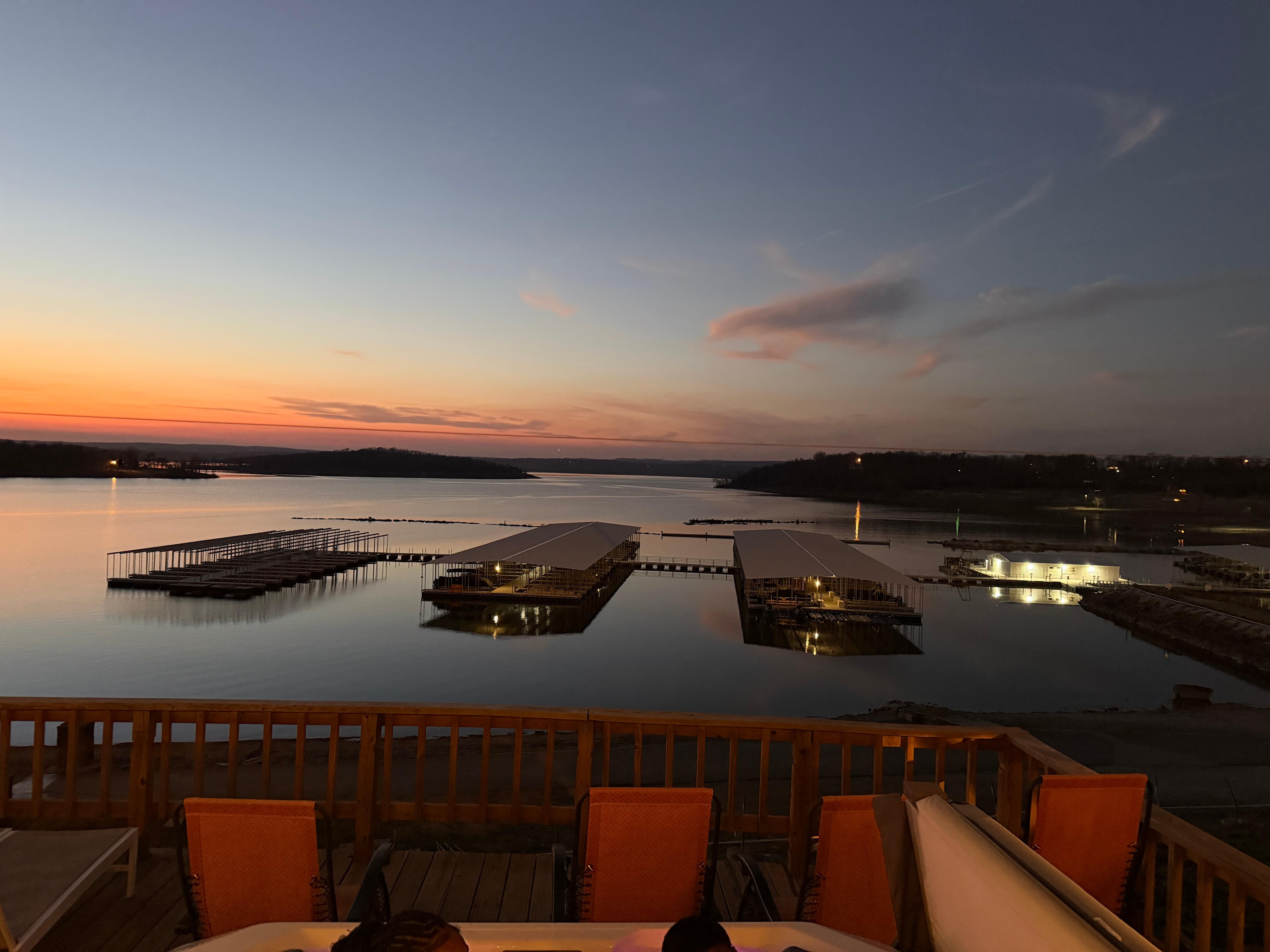 The huge deck across the front of the home, boast stunning lake views. As you relax in the 8-person hot tub, you can enjoy watching boats coming in and out of the marina area. Tranquility awaits you as you take time to sit in the cozy swings and watch the lake activity. Cook every meal on the 36" Blackstone griddle, as you watch boats launch right below.