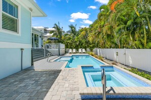 - Outdoor Level: Heated pool, spa, lounge seating, and shower — framed by tropical palms for added privacy.