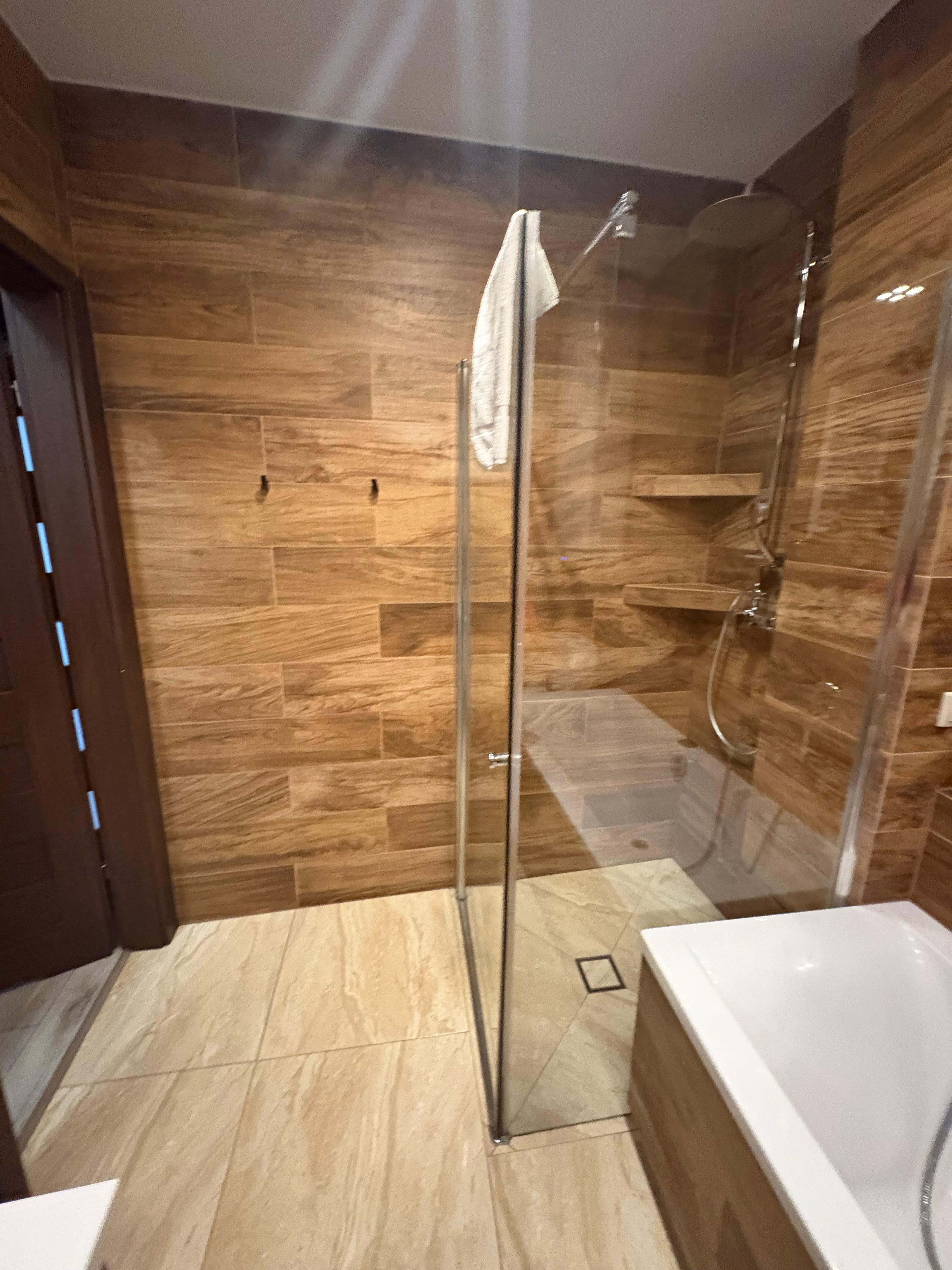 Shower, bath, toilet, washbasin, washing machine, hairdryer, mirror, towels