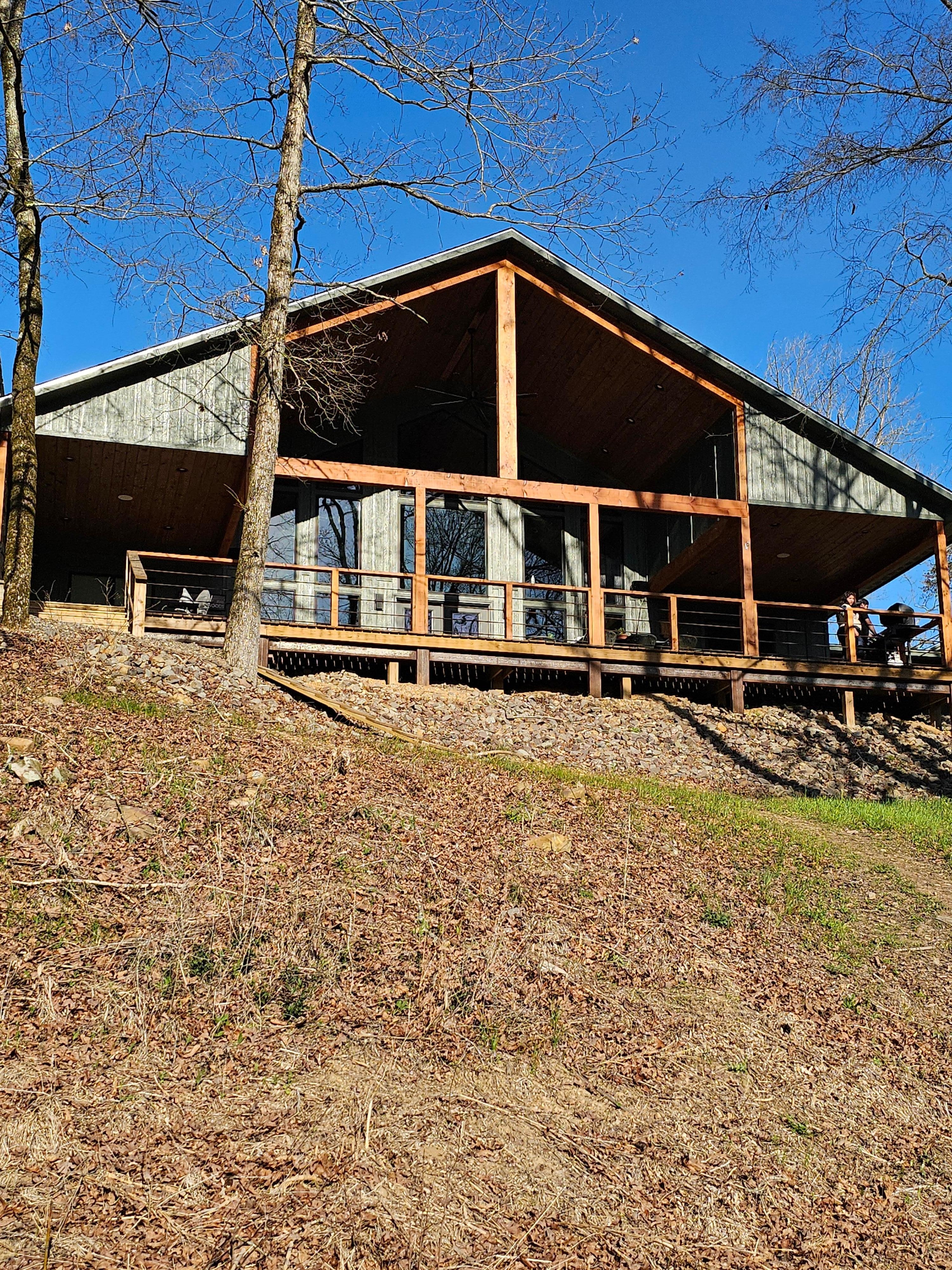• Large covered deck with soaring wood ceilings and river views