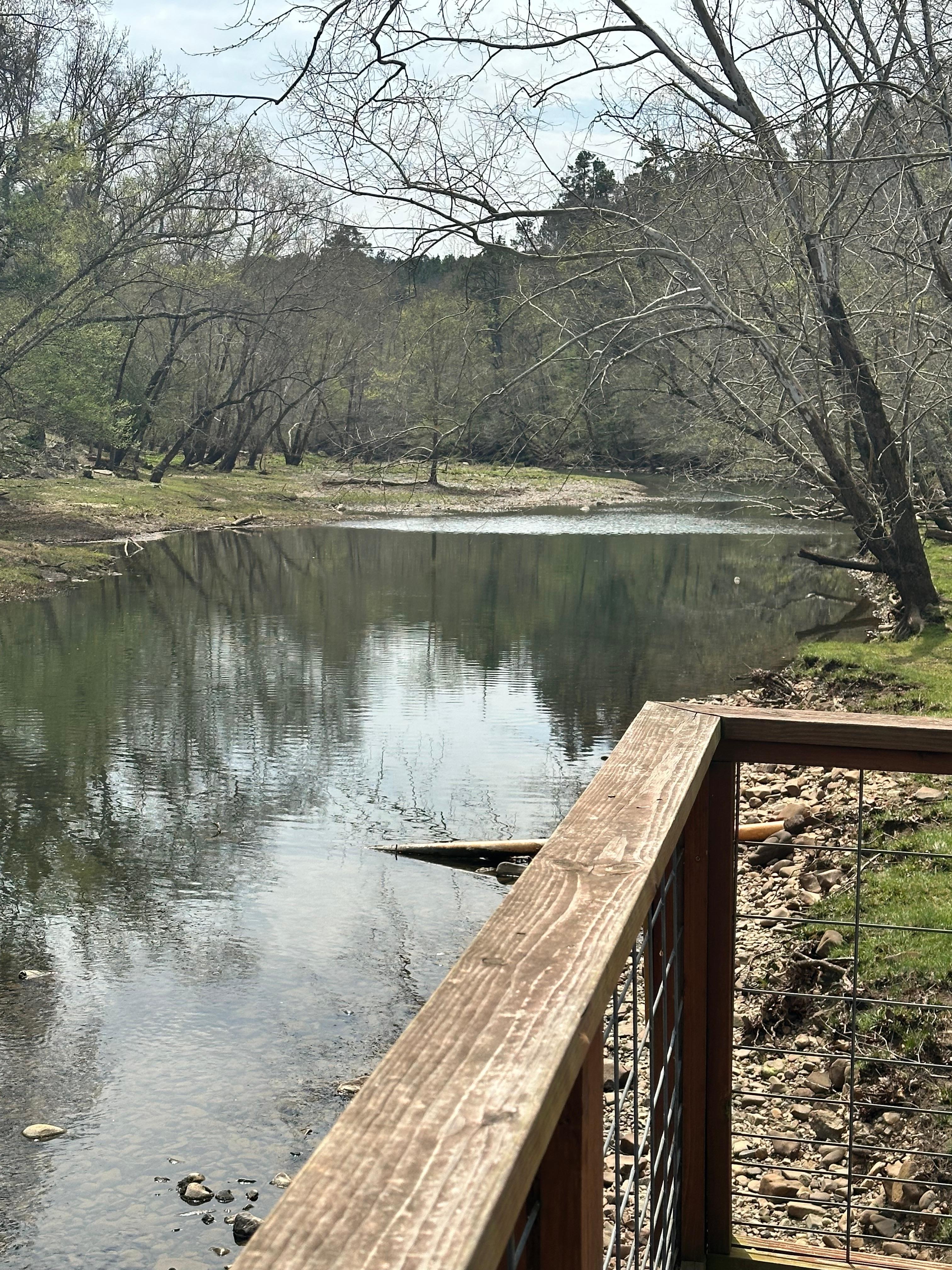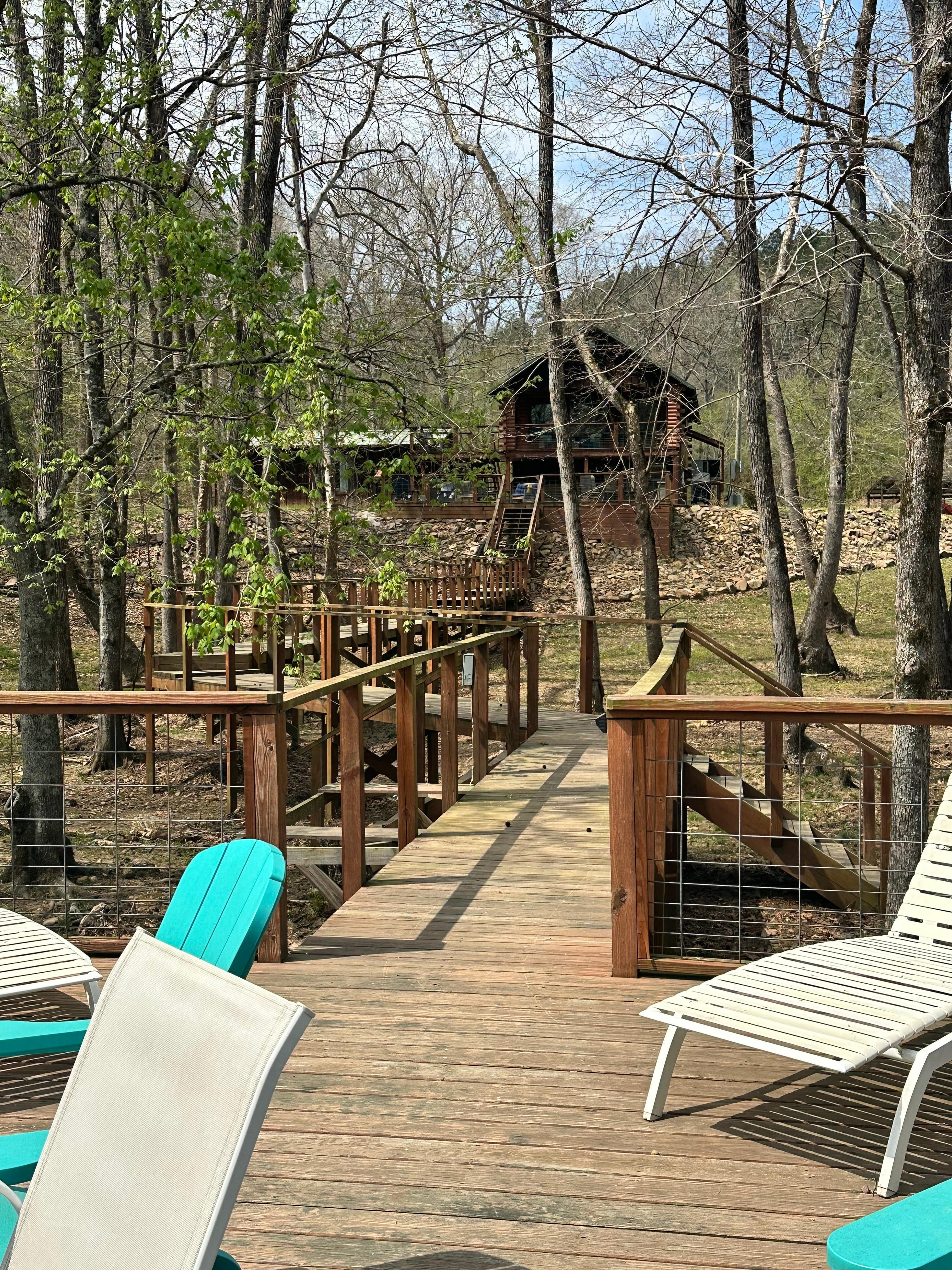 Right on the river! Enjoy our 5 acres of secluded mountain forest perfect for getting out of the city and into nature. Just down the road from us is 37,000 acres of wildlife management area. Fish right from our deck or the riverbank. Deer and turkey abound. We are only 7 miles away from Crater of Diamonds State Park. 18 miles from Glenwood where you can kayak the Caddo River. 35 miles from Caddo Gap hiking trails and our favorite, Winding Stair hike. Bring your ATVs for nearby trails. Lake Greeson is 6 miles away and offers pontoon rentals, and boating activities. King bedroom that has the queen sleeper sofa is a DETATCHED grandmothers suite and the bunkroom on the ground floor of the main cabin with the kitchen. The property is remote and it would be difficult for a Porshe to manage the road, our neighbors Prius made the trip.... any SUV is fine. The gravel road into the cabin is a mile long and has some steep hills. The cabin is not really designed for large people. The ceiling height in the kitchen, bunk room and outdoor kitchen area is 6'2" , the indoor staircase is relatively narrow and the furniture is not designed for large people over 250 lbs. The bunks in the bunk room are really made for kids even though they are regular size twin bunks, they are not built to hold a lot of weight.