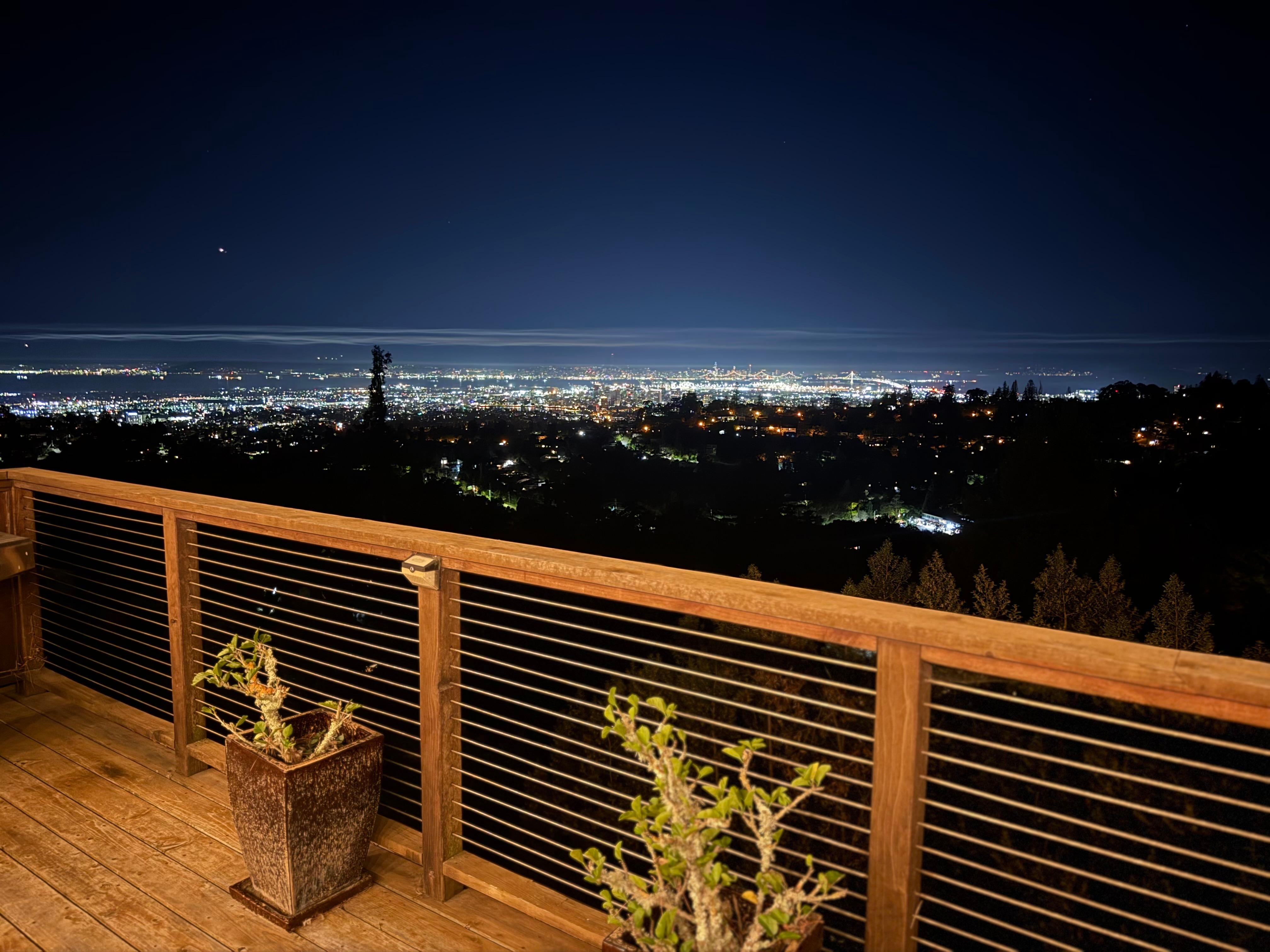 My spouse and I spent two weeks here while recovering from surgery. Spacious yet cozy, with a view of Oakland and San Francisco that will dazzle your very soul. Well appointed with everything you need to chill in luxury and comfort.