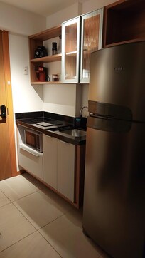 Pontos positivos: apartamento era ótimo. Encontrei extremamente limpo e em bom estado de conservação, bem novo, com cama bem confortável e TV 43". Os funcionários da portaria são bem solicitos e academia é ótima, funciona 24hs. Praias, farmácia, uma padaria que serve café da manhã e almoço na mesma rua, supermercado não muito distante. Há copos, talheres, pratos, secador de cabelo e ferro para passar.