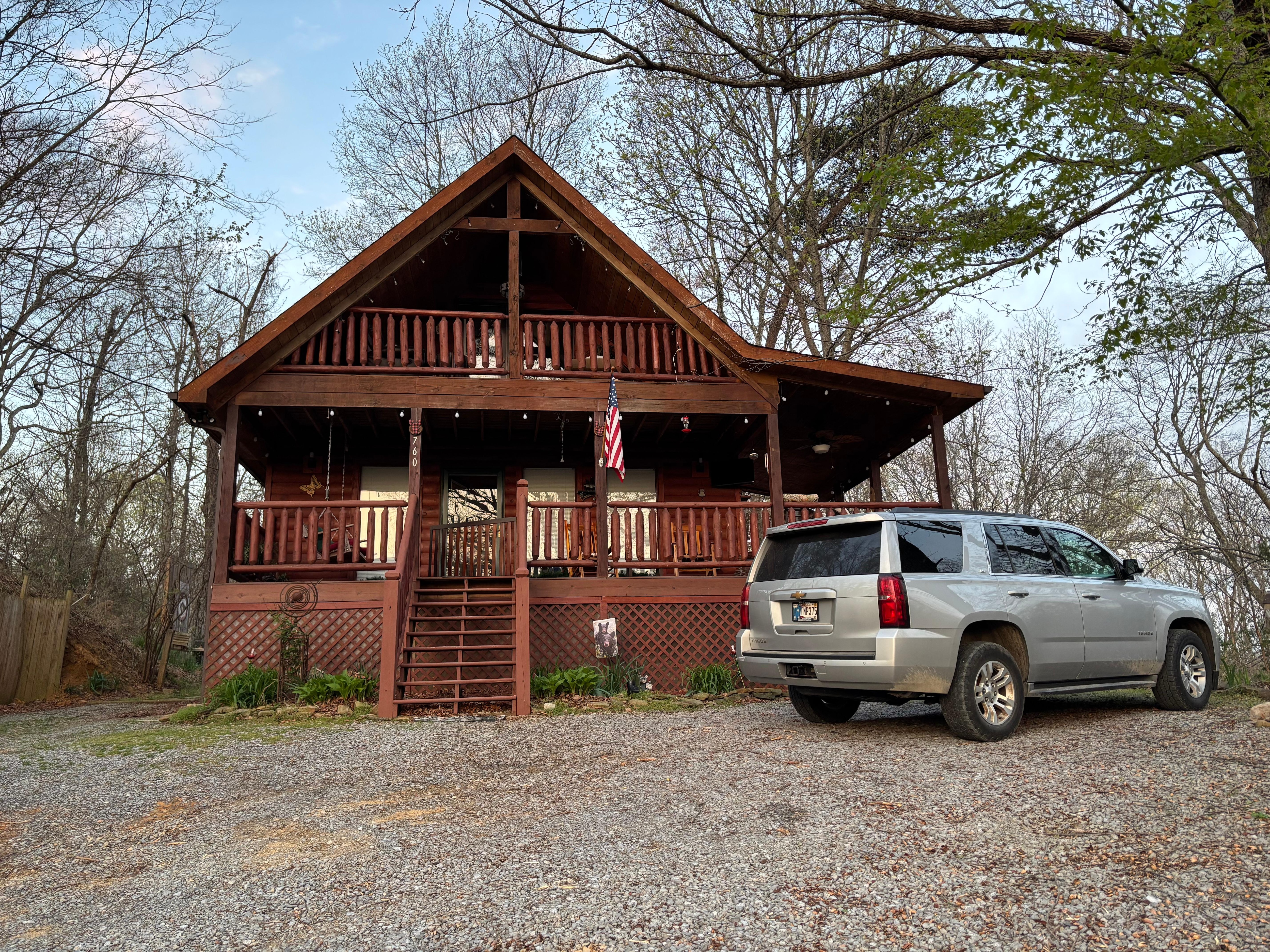 Located in Sevierville, enjoy what this adorable 2-bedroom cabin has to offer. With 2 queen beds, 2 bathrooms featuring a shower and jetted bathtub, and a cozy living room with a sofa bed, our place will help you feel at home. Enjoy the hot tub after a long day of play. Make dinner in the fully stocked kitchen or just rock away in the rocking chairs on the front porch.