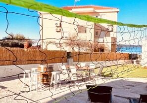*NEW Facilities* in 2025. The front yard which is over 100m2 has a new outdoor lounge, dining table and sun baking chairs with umbrellas. This area has a 180 degree view of the Mediterranean Sea and sunsets. The back yard which is over 400m2 now has Badminton, Bocce, new dining area that overlooks Sea sunset views, small table with stools, and small golf putting area. Also for guests a paddle board, beach mattresses, snorkel gear and beach umbrellas.