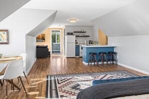 You truly have everything you need in this studio. Cute little kitchen, nice little living room space, quaint little dining room area, comfortable king size bed (the pillows were like marshmallows - so cozy!), and a generous sized bathroom/shower. This is a good sized studio - our family of four + our pup had plenty of space to stretch our legs. It's really a great spot! They put a lot of thought into creating this space - it's nicely furnished, well-kept, and clean.