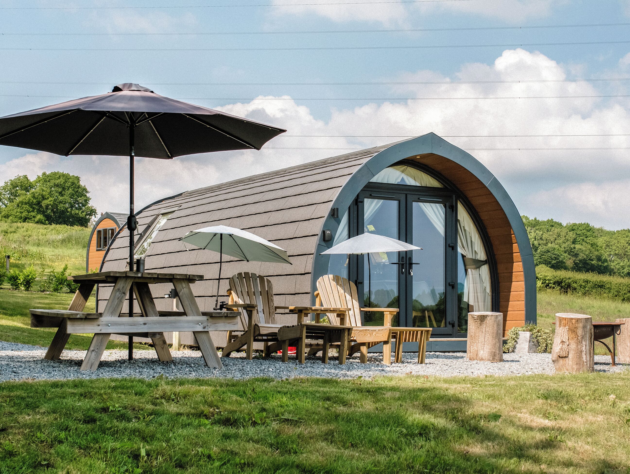 • an open-plan living room with L-shaped sofa with far-reaching views of woodland