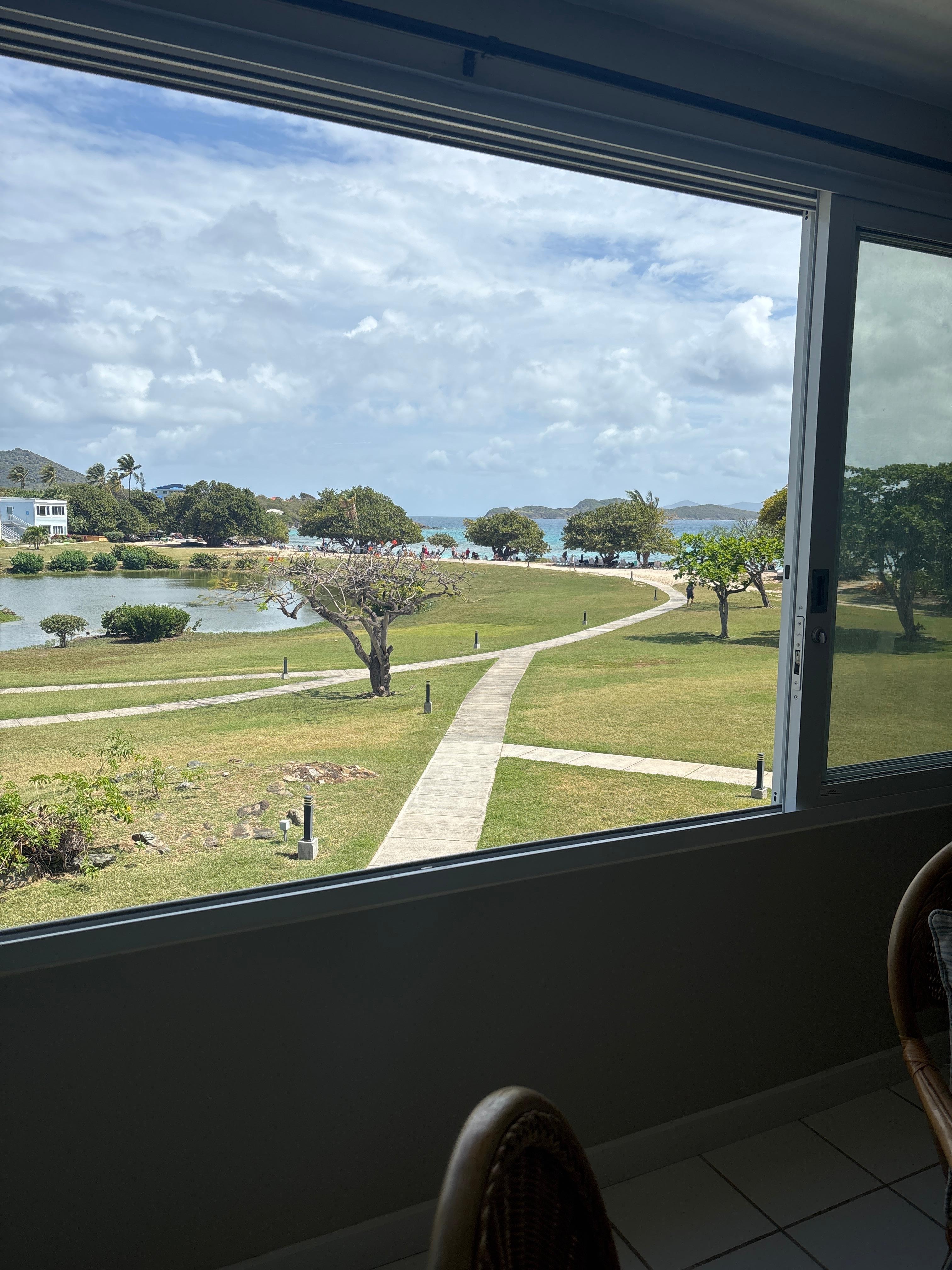 Wow! Great view of the private beach which is next to the accessible beach making it perfect for quiet times and conveniences of bar, food, fun, locals, dancing, and all the fun of Sapphire Bay. You can sit in the shade of a tree on the beach or out in the sun on the private beach. Walk 100 feet down the sand and enjoy the livelihood of the beach bar, corn hole, music, and great food. The coffee shop that opens at 7am is wonderful and in the same convenient spot. The ferry is close by and the best restaurant on the island, Pangea, is next door. The second floor view is incredible and well worth a flight of stairs. The condo is well equipped with beach gear, games and books. All appliances, air conditioning and furniture was working well and made for a great place to hang out. Did I mention the view? Amazing. A clean place for a get away.