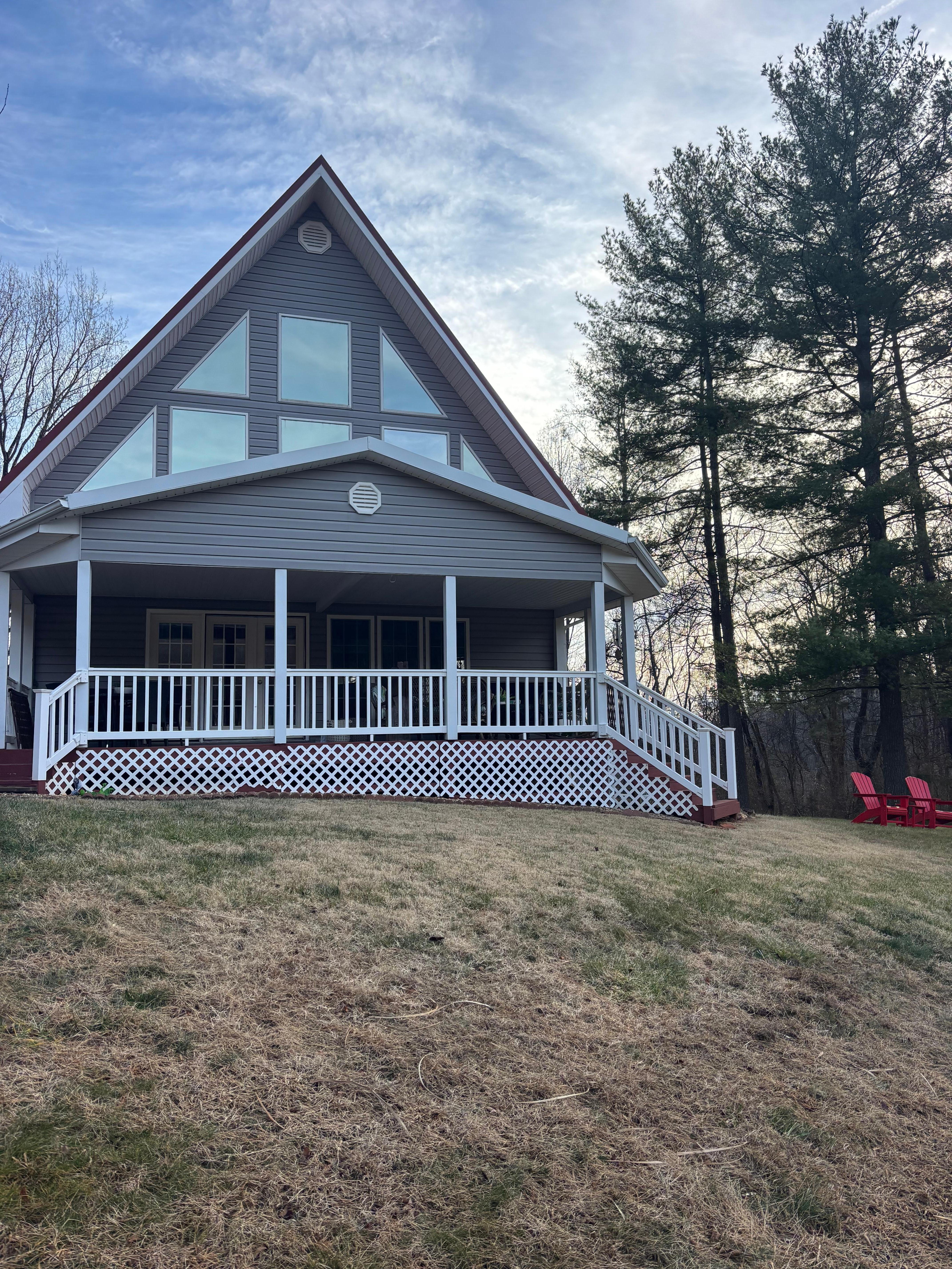 Windy Knoll invites you to come and relax and enjoy the stunning views of the Afton Mountain greenery. Large A-Frame windows allow the sunlight to come through so you can enjoy the birds and nature all around. The property sits on 3.5 acres so it is very private. An expansive rolling lawn in the front to enjoy watching the deer in the morning while having a cup of coffee on the wide front porch. Forest areas on the side and back of the house. Enter the home in the front door and a warm and welcoming living room await you with a couch, 2 comfortable chairs, and a gas burning fireplace. Throw blankets and pillows for snuggling while watching a movie. TV and DVD player with a selection of movies to choose from. The dining room with bay seated window has a large table to seat 6 comfortably. The front porch also has a dining table. Spacious, well appointed kitchen with all you need for preparing delicious meals after a day of hiking the Appalachian trail or sightseeing. Dish-ware, flatware, sauce and saute pans. Wine glasses, coffee mugs, serving ware. Crock pot, blender, mixer. Coffee pot with coffee bean grinder (Starbucks coffee beans in the pantry). You will find a few condiments in the refrigerator, spices, herbs, oil in the pantry. The loft bedroom has a Queen bed and a Double Bed with a private bathroom and shower. The first floor bedroom has two twin beds and a separate bathroom with walk in shower. Loft area also has a desk with laptop and printer for your use. Back deck has a grill all ready for those barbecues!