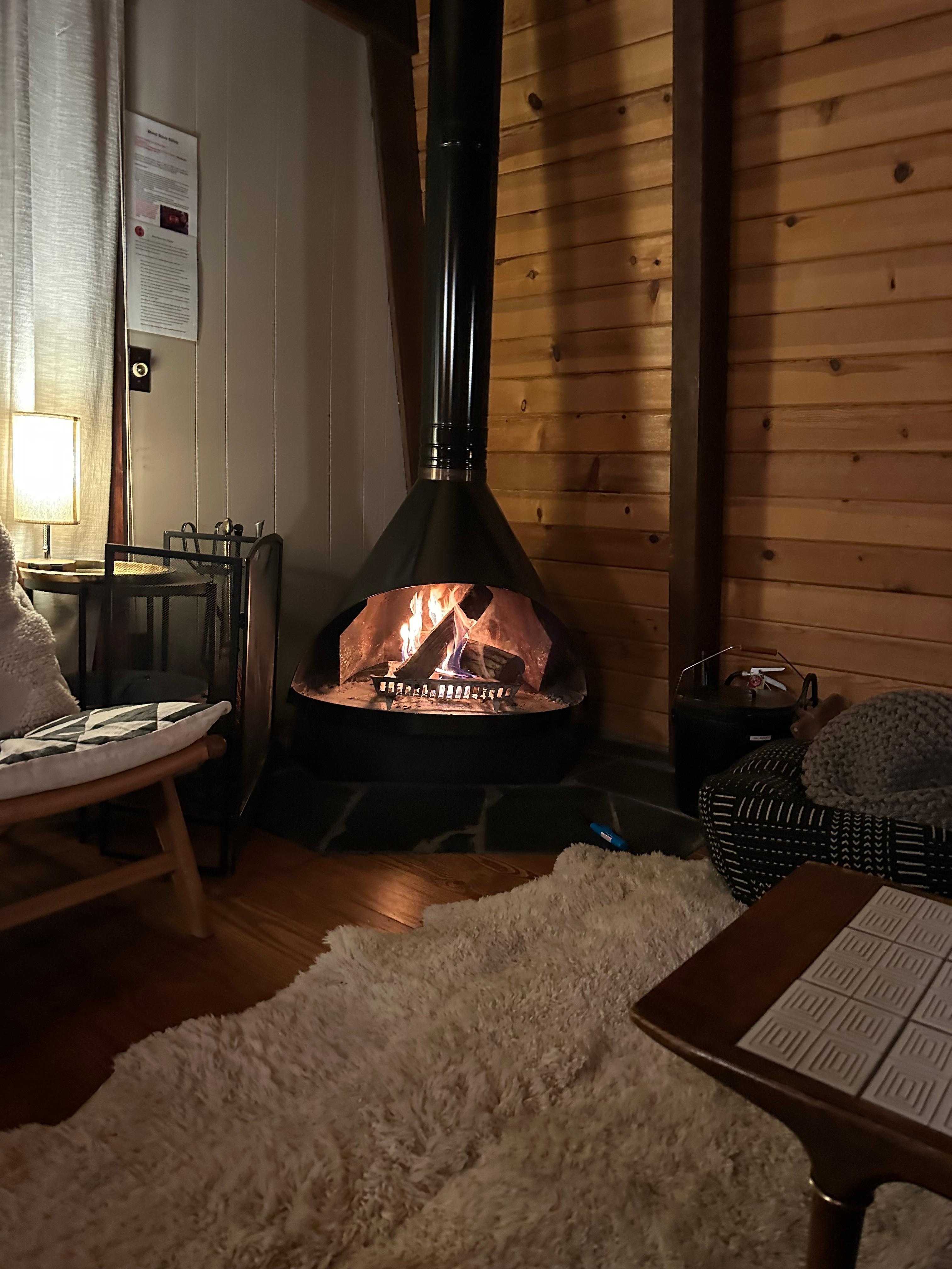 Retro wood-burning fireplace (actual firewood, not a toggle switch)