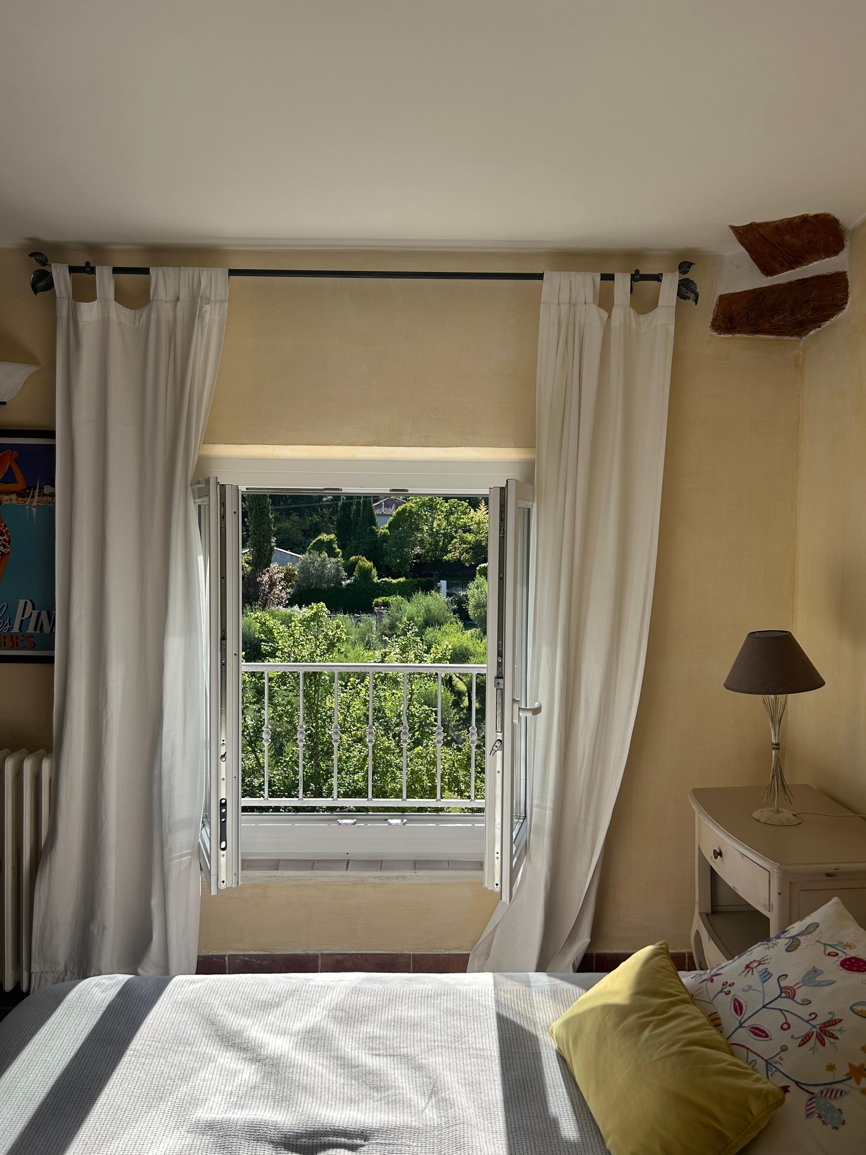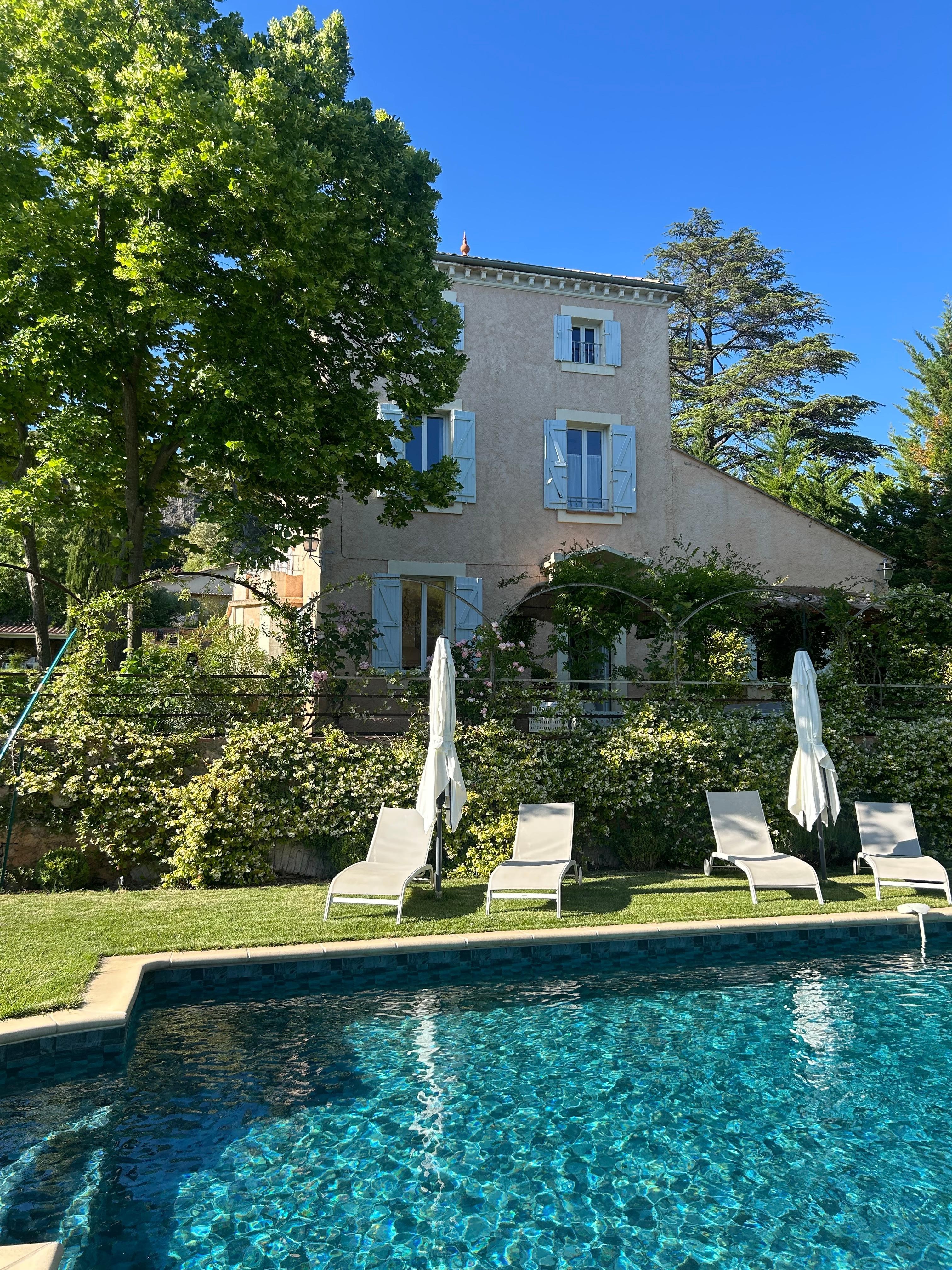 yards and other Mediterranean species. 4 double bedrooms, one of which is independent and 1 triple bedroom. Each room is equipped with a shower room or bathroom and a toilet. An additional w-c is on the 1st floor. Air conditioning and fan in all rooms. Central heating throughout the Bastide. Large fully equipped kitchen, dishwasher, washing machine, five spout gas cooker and oven, microwave, coffee machine and Nespresso machine, American fridge. Iron and ironing board. Vacuum cleaner. TV lounge, CD player. Wifi throughout the Bastide. Private swimming pool of 10 m by 5 m heated, salt filter with alarm and shower. The swimming pool is open from 1 May to 15 September. Outdoor terrace with living room ,dining area and electric plancha. Bed linen, bath and pool towels are provided as well as kitchen towels.