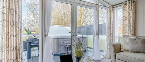 The lounge has 2 comfy sofas (1 is a large pull out sofa bed), a smart TV, fire and log effect remote controlled electric fire and integrated Bluetooth speakers. Patio doors lead out to the hot tub with relaxing mood lighting and there is also outdoor dining.