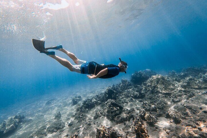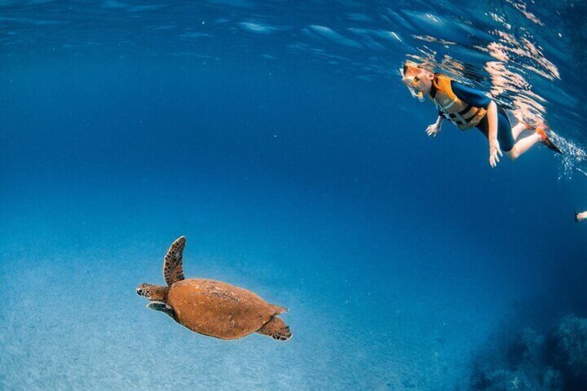 Imagine yourself snorkelling alongside magnificent Hawaiian sea turtles, surrounded by vibrant marine creatures. From spiky sea urchins to curious octopuses, majestic manta rays, puffer fish, and more, our ocean is teeming with wonders just waiting to be explored! The best part? Your high-definition photos are included at no extra cost, allowing you to relive your experience again and again. Rest assured; your safety is our top priority. Our expert team will provide a comprehensive safety briefing and guide you through the simple operation of our top-of-the-line snorkelling equipment. Our goggles won't fog up or leak, our wetsuit tops ensure comfort, and our fins guarantee a smooth glide through the waters. If you're a confident swimmer and seek the experience of a lifetime, book your snorkelling adventure with us today! Dive into the unknown and create memories that will forever be etched in your heart. ** This is not suitable for non-swimmers or beginners.